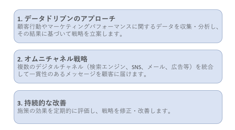 デジタルマーケティングコンサルティングは以下の3つの基本概念に基づいており、成功のために必要な要素です。