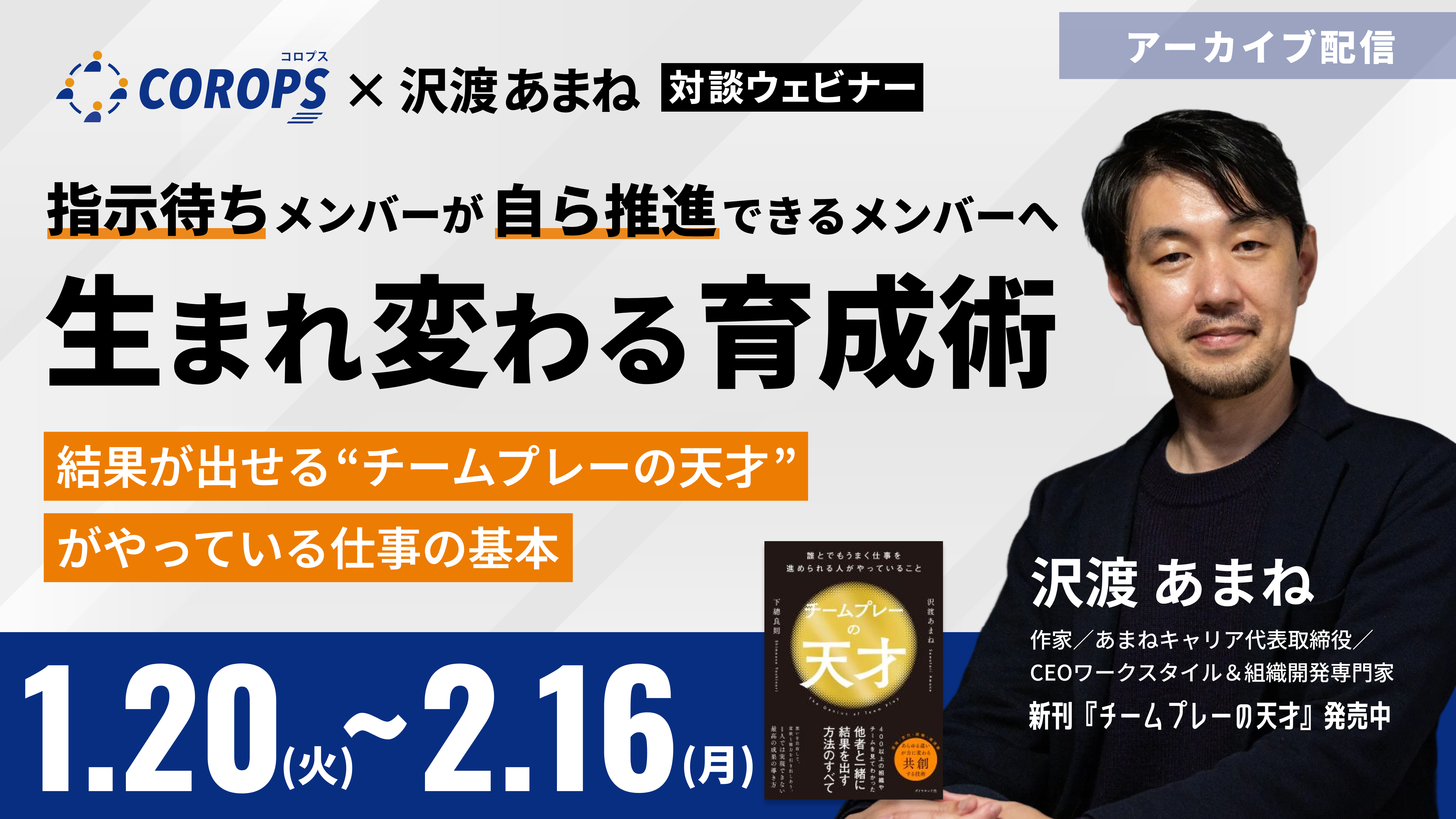 <好評につき見逃し配信中!>【COROPS×沢渡あまね】指示待ちメンバーが自ら推進できるメンバーへ生まれ変わる育成術 ~結果が出せる「チームプレーの天才」がやっている仕事の基本~