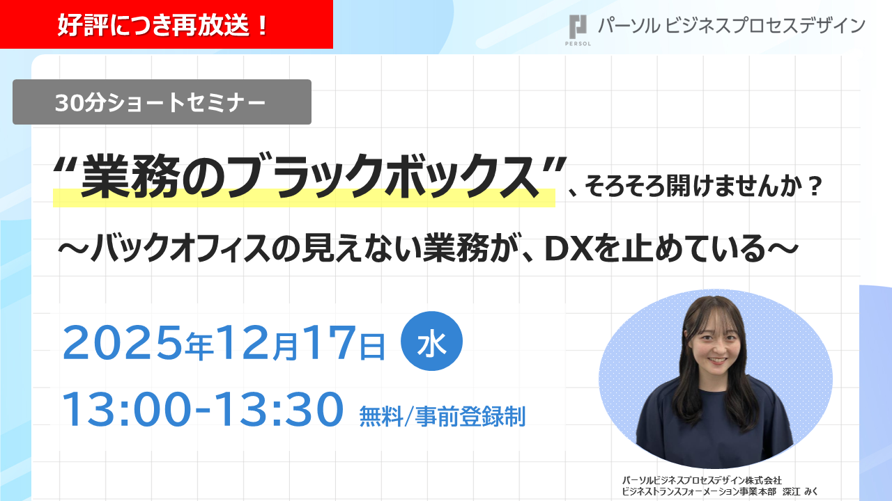 <好評につき再放送>“業務のブラックボックス”、そろそろ開けませんか?~バックオフィスの見えない業務が、DXを止めている~