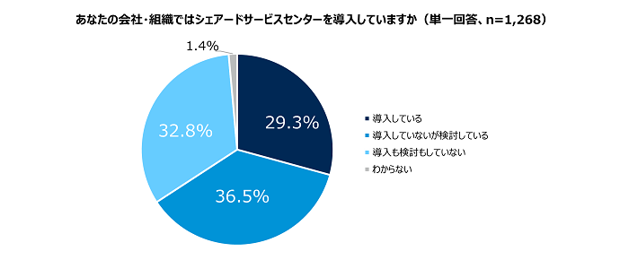 BPO導入の計画・検討・選考に関わる1,268名の経営層または管理職を対象に、シェアードサービスセンター(以下「SSC」)の導入状況について聞いたところ、「導入している」は29.3%(371名)、「導入していないが検討している」は36.5%でした。