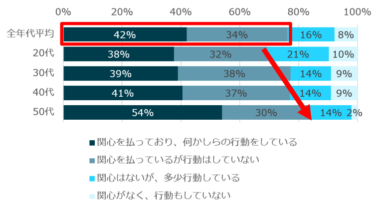 健康に関心を払っている人は20代では70%に対し、50代では84%と14pt上昇した。
