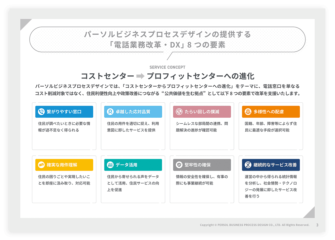 • パーソルビジネスプロセスデザインの提供する「電話業務改革・DX」8つの要素
