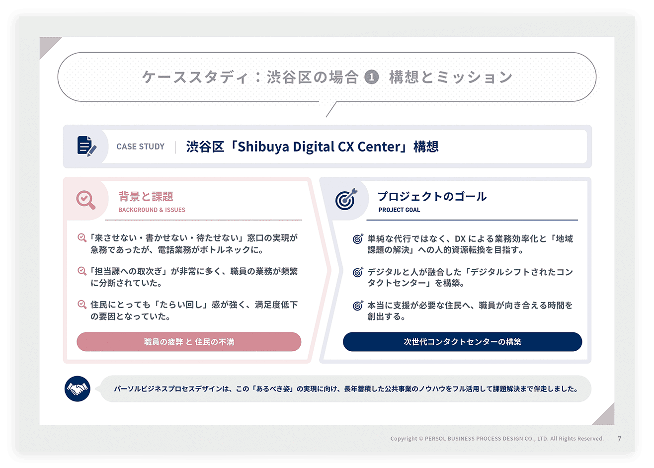 行政手続きのオンライン化が進む一方で、複雑化する電話対応が職員の負担となり、住民の「たらい回し」といった課題が生じています。本資料では、デジタル技術(AIやSMS等)と人の力を融合させた「次世代コンタクトセンター」の構築による電話業務改革・DXの実践アプローチを解説します。属人化を防ぐ独自のナレッジ運用手法「KCS」の仕組みや、住民満足度4.6を獲得した渋谷区様のケーススタディを交え、職員の「時間」創出と住民との「対話」の深化を両立させるノウハウをご紹介します。