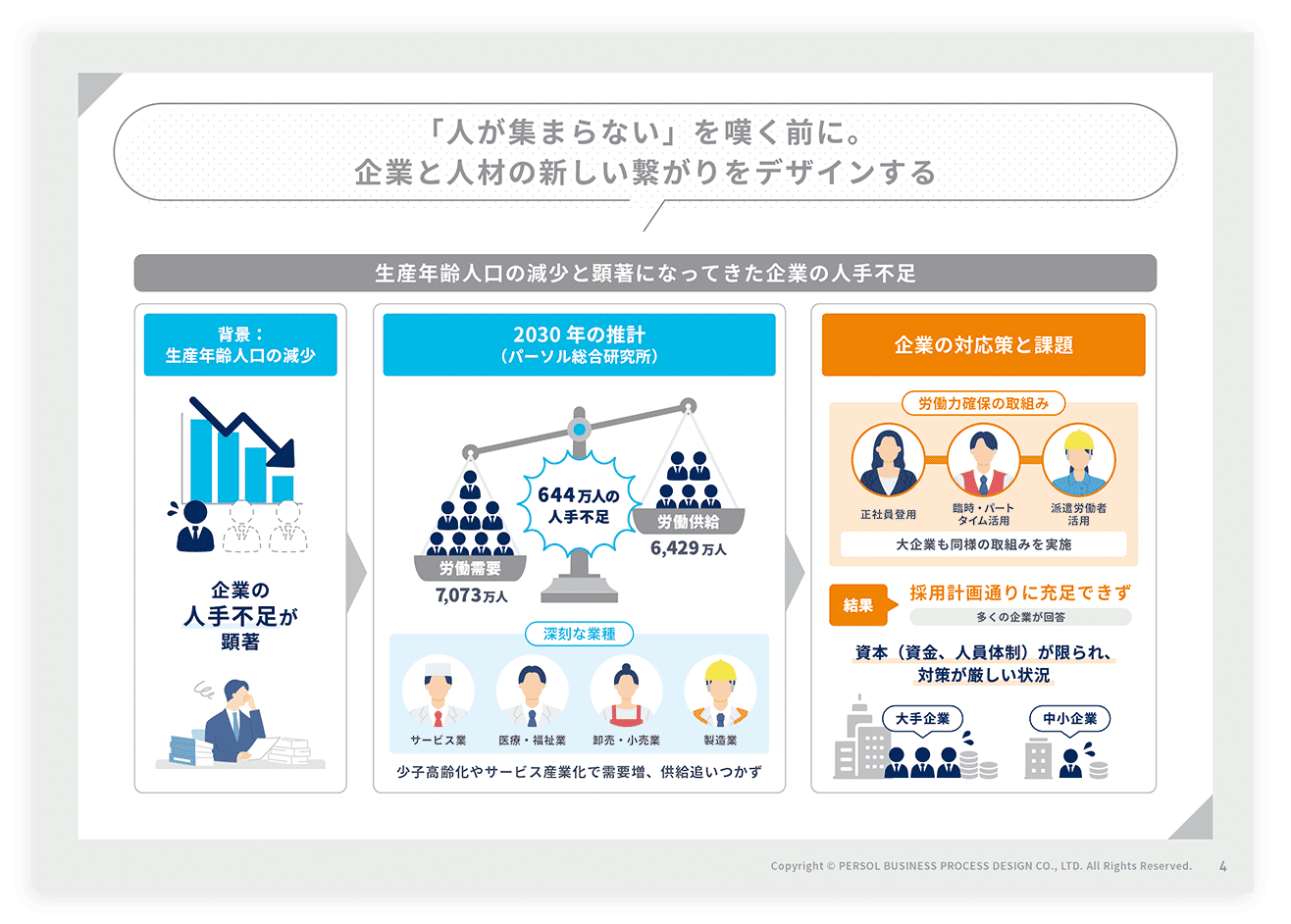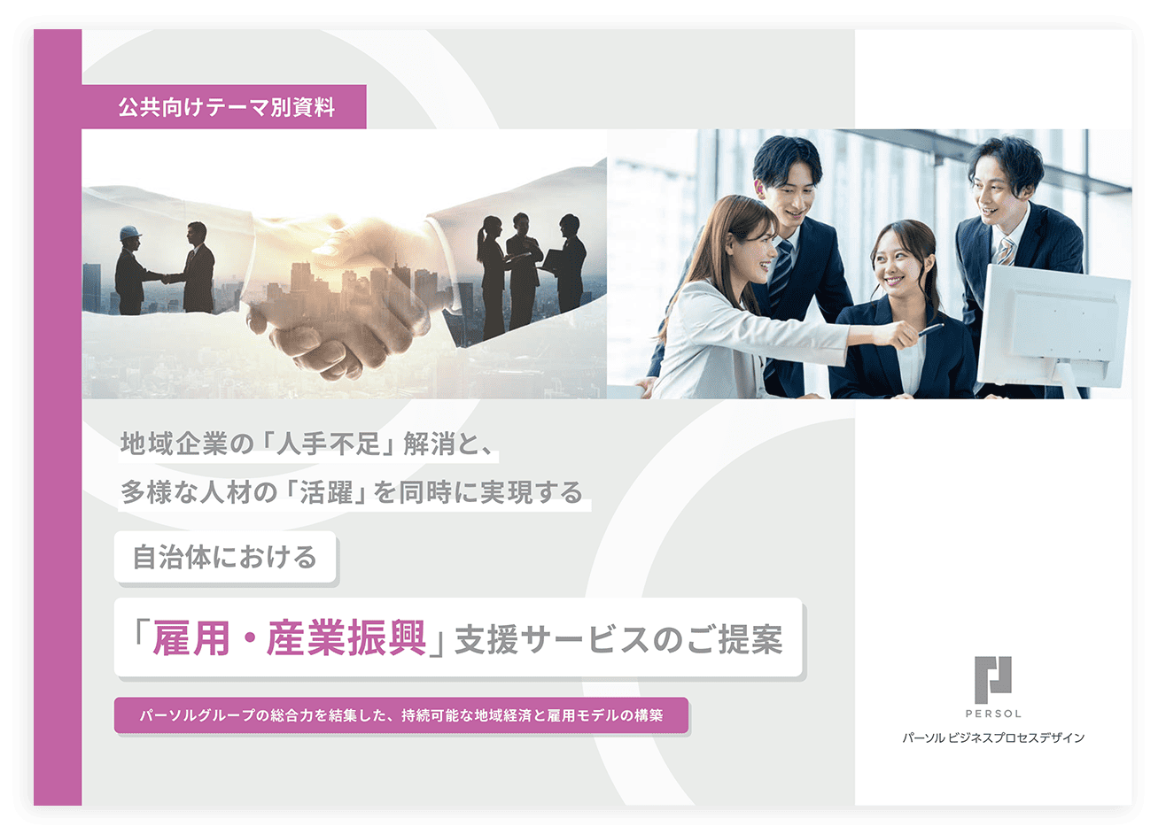 2030年に予測される深刻な「人手不足」に向け、地域を支える中小企業の「生産性向上」と、多様な人材の「労働参加」を両輪で支援するアプローチをまとめた資料です。パーソルグループが約20年の公共事業で培ったノウハウをもとに、企業向けのDX・働き方改革支援から、女性・シニア・若年層などの就労支援、学生向けのキャリア教育までを網羅しています。東京都や宮城県での具体的な成功事例や、事業設計から運用定着までの4つのステップを通じて、持続可能な地域経済と雇用モデルを構築するためのヒントをご紹介します。