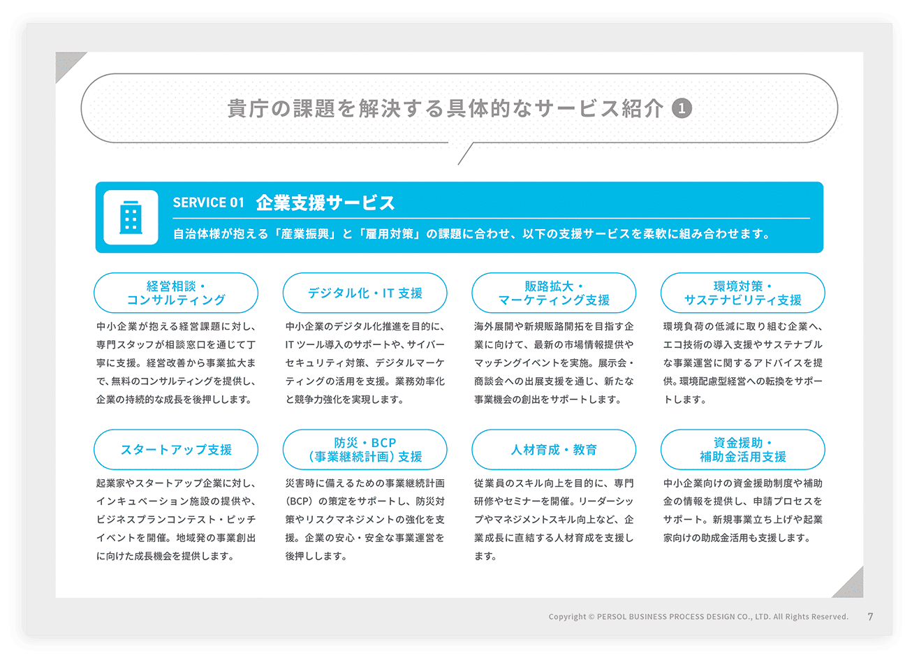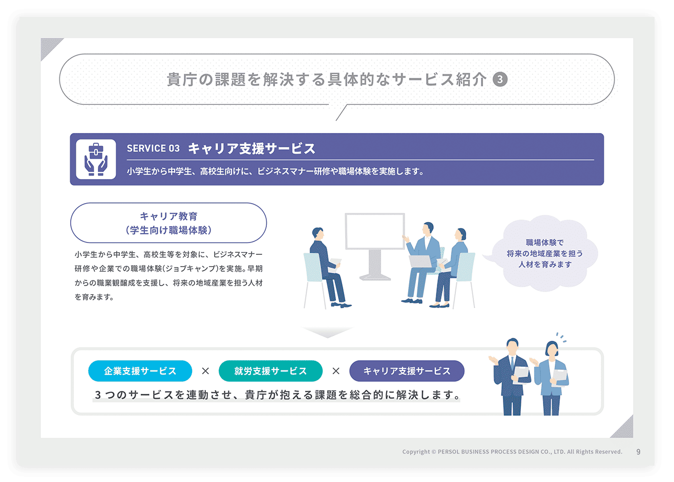 • 貴庁の課題を解決する具体的なサービス紹介(企業支援 / 就労支援 / キャリア支援)