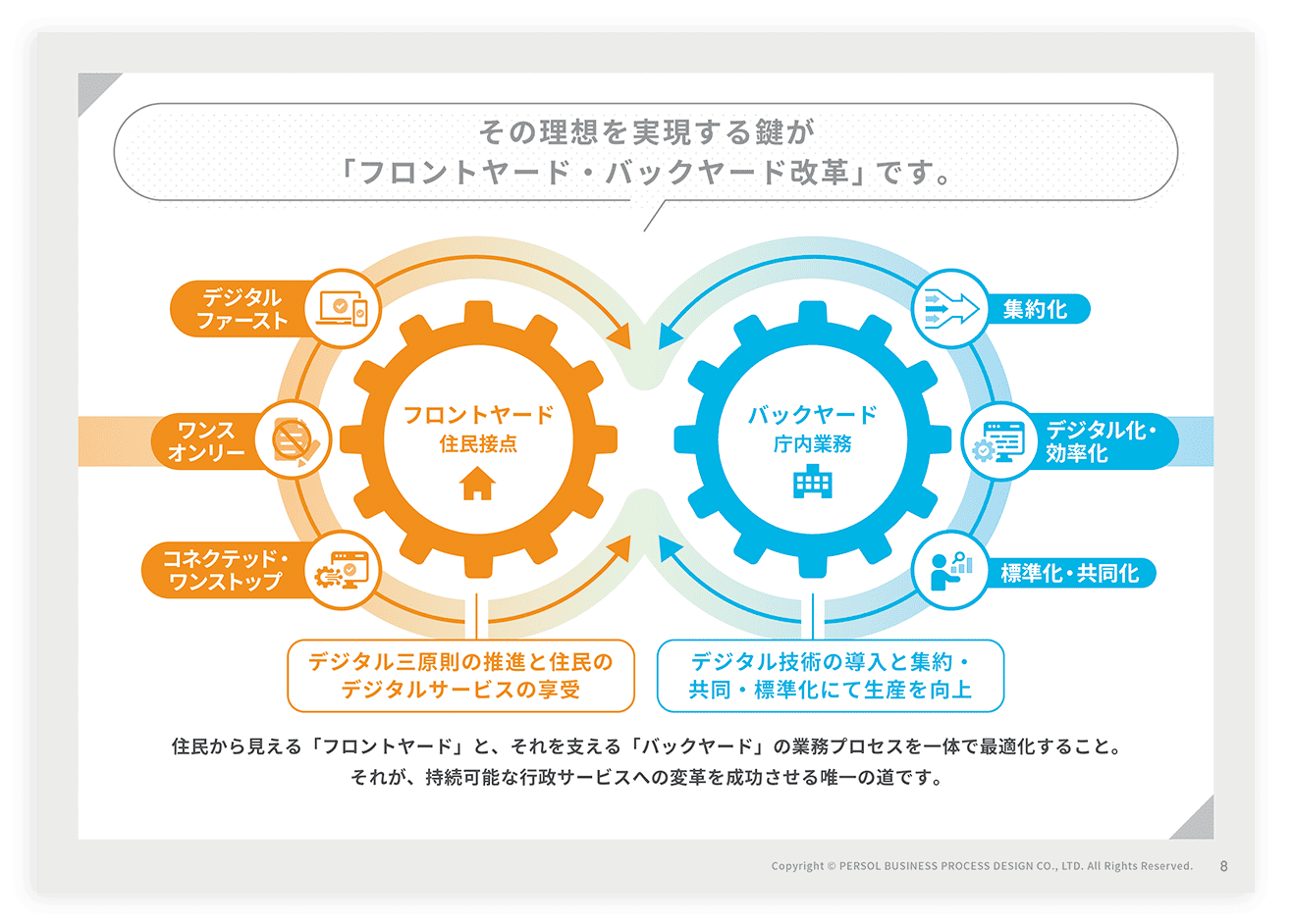 - その理想を実現する鍵が「フロントヤード・バックヤード改革」です。