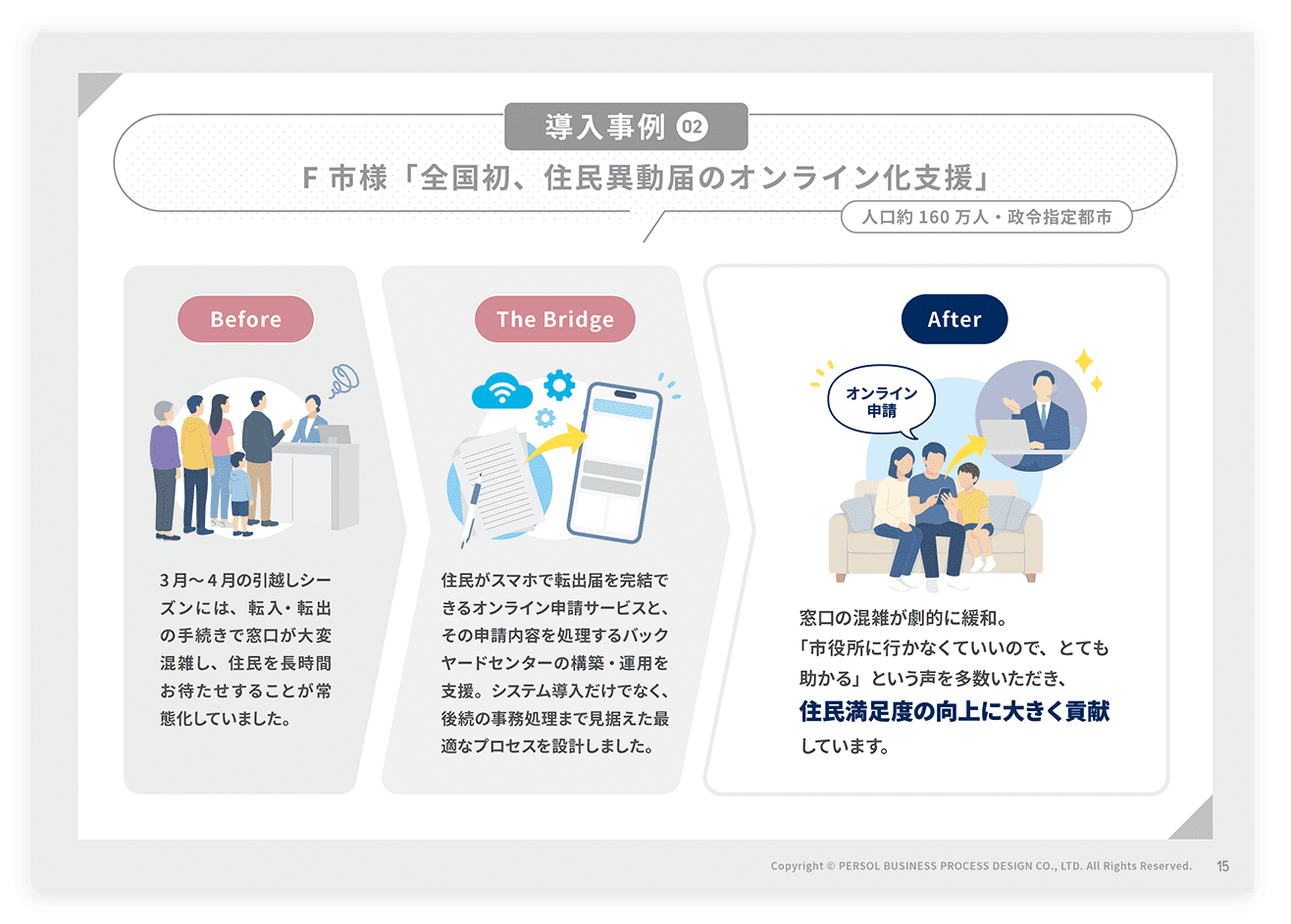自治体を取り巻く「採用難」や「財政の厳しさ」、多様化する「住民ニーズ」といった課題に対し、住民サービスの向上と職員の働き方改革を両立する「フロントヤード・バックヤード改革」の進め方を解説した資料です。業務再設計(BPR)の重要性をはじめ、構想から自走までの具体的な4ステップ、さらに指定都市における行政事務センター設立やオンライン申請支援の成功事例まで、パーソルならではのノウハウを分かりやすくご紹介します。