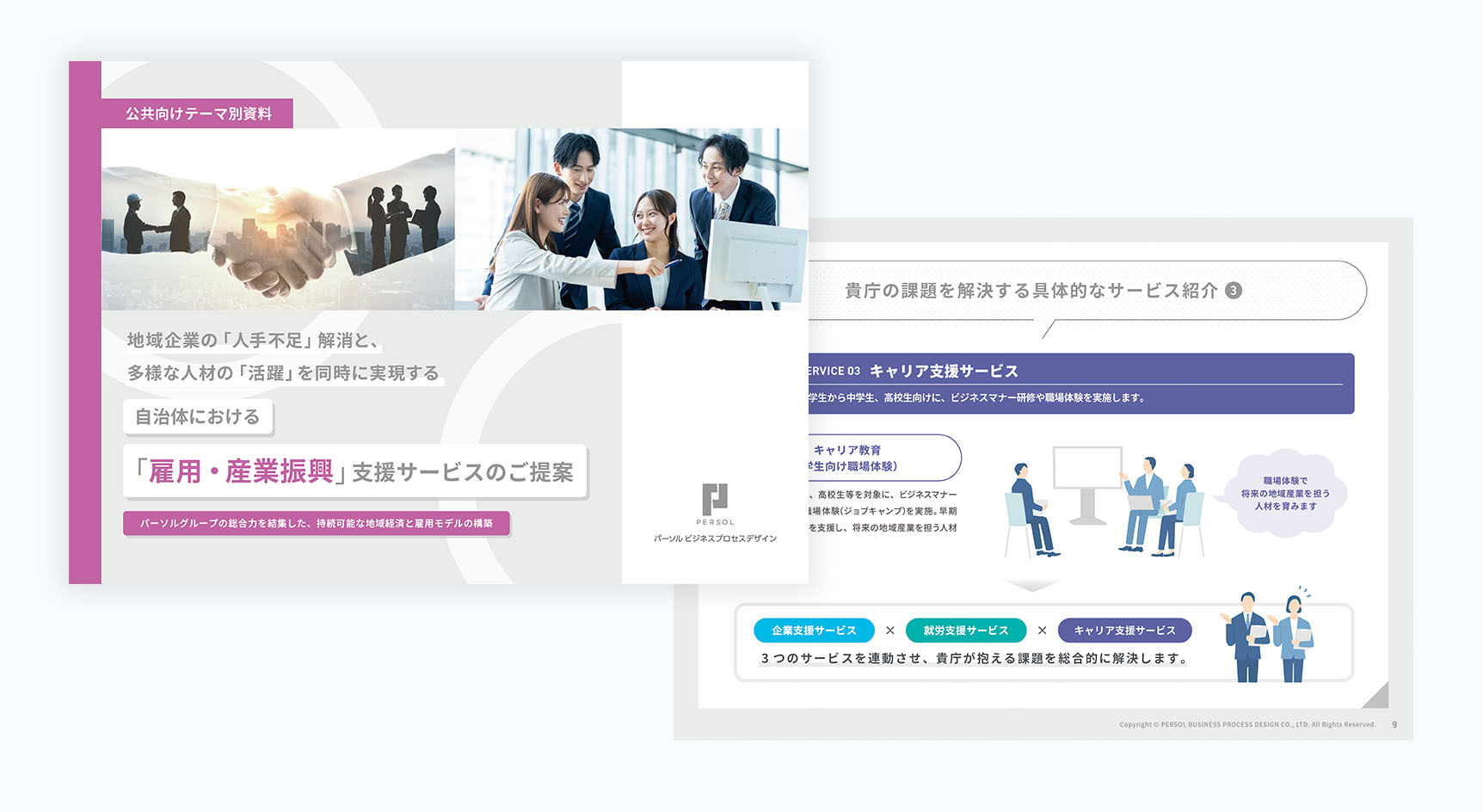テレワーク導入やリスキリングなどの「企業支援」と、女性・若年・シニア・氷河期世代などの「就労支援」、高校生向けの「キャリア支援」まで、3つのサービスを連動させて総合的に解決に導きます。