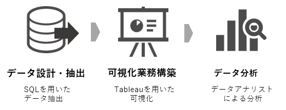 そこで我々は、まずは経験・スキルを持ったデータアナリストによる現状整理を行い、顧客業務の理解を深めながらDBやテーブル、カラム構造を調整・整理したものをドキュメント化し、データ抽出できる状態を構築いたしました。