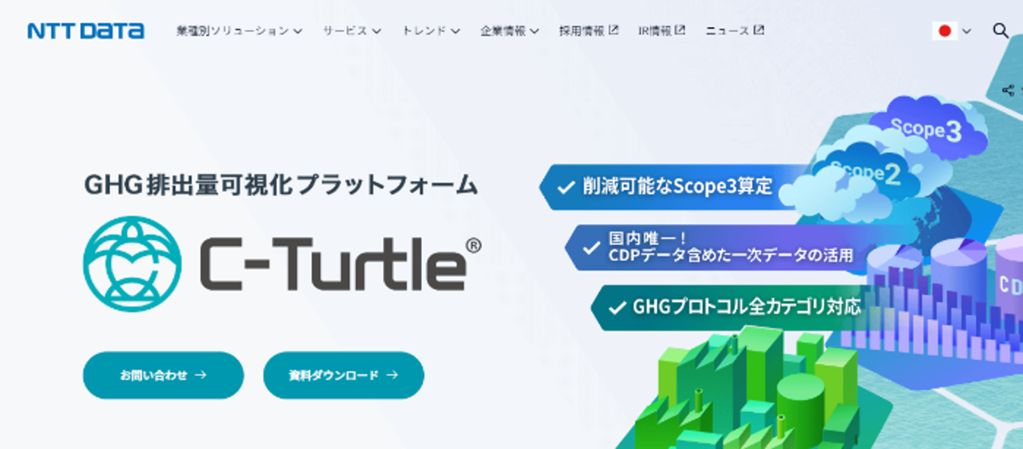 NTTデータの「C-Turtle®」は、GHGプロトコル全カテゴリ対応の温室効果ガス排出量可視化プラットフォームです。サプライチェーン全体の排出量算定において、C-Turtle®は企業の平均値(二次データ)ではなく、気候変動アクションにおいて中心的役割を担っている英国NGO「CDP」が保持する実測値(一次データ)を活用できるため、サプライヤーの削減努力を反映した算定が可能です。また、一括管理・自動での排出原単位の最新化が可能なクラウドサービスのため、従来の複雑で属人化したExcelによる算定から脱却し業務負荷を軽減します。