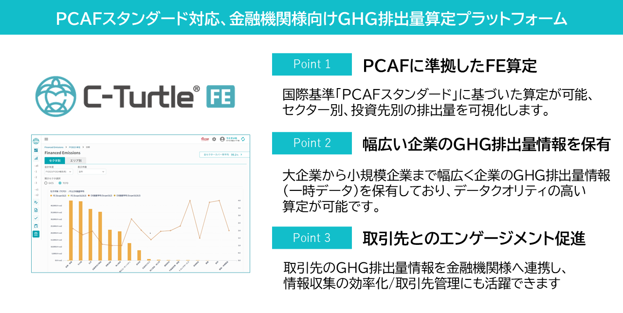 「C-Turtle® FE」は「C-Turtle®」の新サービスとして、金融機関の国際的基準「PCAFスタンダード」に準拠したファイナンスド・エミッションの可視化と削減を支援するプラットフォームです。C-Turtle® FEの導入により、投融資先の一次データを活用し、投融資に係るGHG排出量およびその削減努力を反映したデータクオリティーの高いScope3排出量算定が可能となります。国産ツールとして、最新の規制動向やトレンドに応じ、タイムリーな機能追加、係数データ等の提供を行っています。本年度は投融資先でのC-Turtle®利用を円滑にするための各金融機関法人向けポータルサイトとの連携機能等の開発を進めています。
