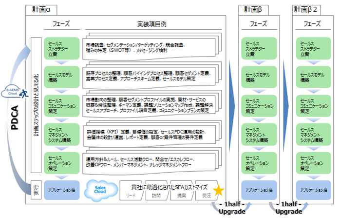 B-AEMSのシステムは、セールスフォース・ドットコム社が提供するクラウドサービス(Salesforce.com)のうち、SFA・CRMに特化したSales Cloudをベースに営業戦略策定から運用までの機能を追加実装した独自システムです。