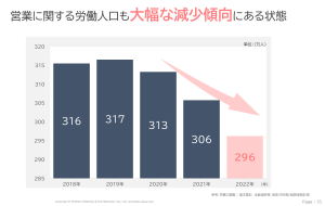 2065年には約半数になってしまう推計がでている日本の労働人口。 営業に関する労働人口も、2018年頃の約318万人から2022年には296万人と大幅に減少傾向にあり、歯止めがかからない状態になっています。 近年では、労働人口の減少により、企業は従来の方法での人員配置やタスクの処理に困難を抱えるようになりました。 その背景もあり、1人あたりの生産性を高める動きが重要視されており、自動化やAI技術の導入・活用が強く求められるようになりました。