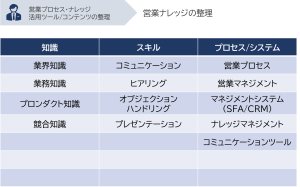 営業プロセスの整理では、顧客の購買プロセスを理解したうえで、どのプロセスで何を使用するのかを整理・可視化します。知識(ナレッジ)、スキル、プロセス/システムの観点からナレッジを洗い出し、整理することで、何が必要とされ、何が不足しているのかを明確にします。