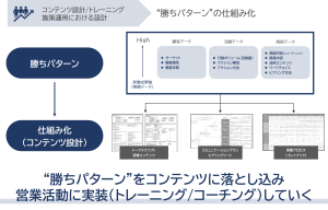 コンテンツ設計・トレーニング/運用設計では、”勝ちパターン”を明確に理解した上で、その情報をコンテンツに落とし込みます。合わせて、適切なトレーニングプログラムを設計し、日々の営業活動に必要な仕組みを構築し整備します。