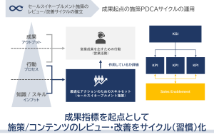 定期的に結果を評価し、改善を行うことがプロセスにおいて重要です。成果指標を起点として、施策/コンテンツのレビュー・改善をサイクル(習慣)化します。パフォーマー一人一人の最適なアクションのためのスキルセットを行い、その結果として営業成果を出すための行動に作用しているかを正しく評価し改善を行うことで、営業成果・生産性を底上げするセールスイネーブルメントの取り組みと言えます。