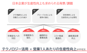 テクノロジーの急成長とグローバル化による市場競争優位性の激化、技術革新による生産性の向上の必要性が日本企業内で叫ばれるようになり、営業組織は、市場変化の対応・競争力の強化、持続可能な事業成長、コスト削減・最適化など、様々な課題に対する対応を求められるようになりました。 これらの課題に対応するため、テクノロジーの活用と営業1人あたりの生産性向上が不可欠な状況になっています。