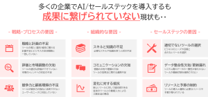 テクノロジーなどの技術革新により、現在、セールステック市場は大きな盛り上がりを見せ、多様なセールステック/AIツールの登場で選択肢が溢れています。 しかし、多くの企業が導入・活用に向けて動き出しているものの、成果に繋げられていない現状があります。
