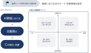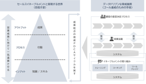 セールスイネーブルメントとは、一般的には営業組織のパフォーマンスを向上させるために、必要な情報やリソースを提供する施策のことを指します。 弊社では、データに基づく効率的かつ効果的な営業組織づくりの仕組み作りによる成果を輩出し続ける営業人材の育成を「セールスイネーブルメント」と捉え、インプット・プロセス・アウトプットを営業成果起点に向けて一気通貫でPDCAサイクルを回していく施策が重要であると考えます。