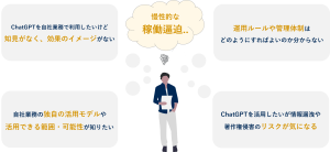 ChatGPTの可能性は大きいものの、ビジネス利用に向けては明確な対応策や策略が必要となります。具体的には、どの種類の業務にChatGPTを活用できるのか、情報漏洩のリスクは如何に回避するのか、そして、どのような管理体制を構築すべきなのか、といった問いに対して的確な答えを見いだすことが求められます。