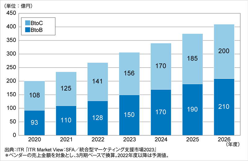 統合型マーケティング支援市場規模推移および予測 BtoB、BtoC別(2020~2026年度予測)