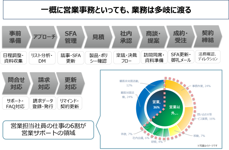一般的な営業担当社員は、一日の業務時間のうち約6割が、商談・提案など顧客に対する営業活動以外の事務作業に費やされていると言われています。
