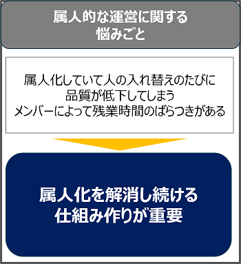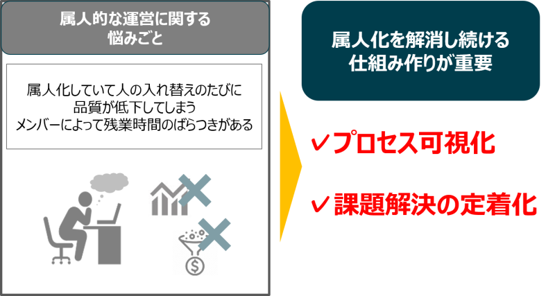 「業務が煩雑で属人化しており、人が入れ替わるたびに品質が低下してしまう」 「業務プロセスが整備されていないため、品質が統一されない」
