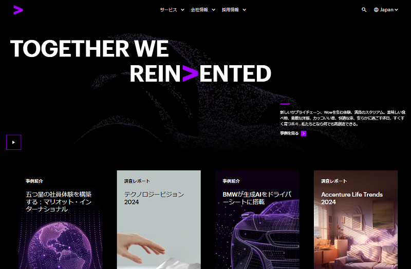 アクセンチュア株式会社(Accenture Japan)は、企業課題に対して戦略策定やシステム構築などを行い、解決する総合型コンサルティングファームで、AI活用やメタバース、人材・組織管理など様々なサービスを提供しており、世界規模での展開が大きな特徴です。